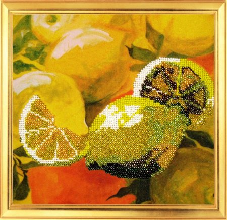 Перед нами полотняный холст, на котором изображены сочные лимоны, частично вышитые бисером. Снова прибегаем к помощи рассматриваемой выше таблицы: