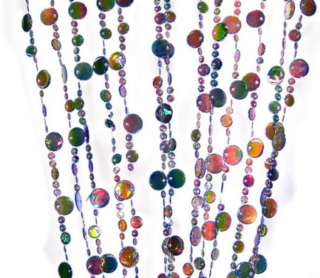 Перед нами декоративный предмет интерьера, радующий глаз и привносящий в привычную обстановку нотку оригинальности. Шторы выполнены из дихроичных бусин, произведенных чешскими стеклодувами. Такая фурнитура образуется в результате высокотехнологичного способа обработки стекла с включением металлической прослойки. В зависимости от угла освещения, бусины могут менять свой цвет. Исходя из внешних характеристик, делаем соответствующие выводы: