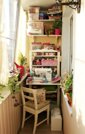 Место для работы необходимо установить так, чтобы свет падал слева или спереди. Но последнее редко получается провернуть на балконе. Зато можно приобрести раскладной стол, который при необходимости превратится в более просторное рабочее место. Если планируется использовать тонкую технику, например, швейную машинку, важно подобрать для неё чехол или обеспечить место хранения в квартире. Даже при утеплении сложно обеспечить нужный режим влажности.