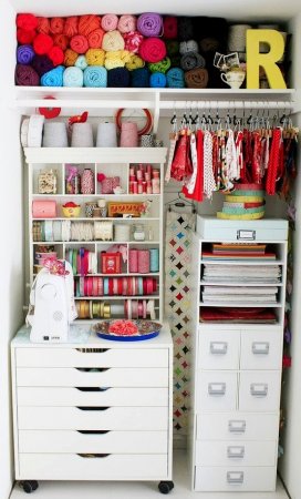 Если избавиться от хлама, который обычно скапливается в кладовке годами, можно обнаружить, что это весьма просторное помещение, где есть место и для швейной машинки, и для других приспособлений. Обставлять такую мини-комнатку нужно грамотно. Мебель можно закупить, но большую часть придется делать самостоятельно. Ведь никто, кроме вас, не угадает, как лучше расположить сотни предметов, необходимых вам для вашего хобби.