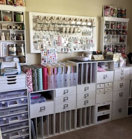 Многие рукодельные занятия не требуют большого количества свободного места. Например, плетение из бисера или декупаж позволяют расположиться на одном столе. В таком случае, отличным выходом будет приобретение навесного шкафа-стола. Если найти систему, включающую большое количество полочек, ее будет несложно переоборудовать под свои требования.