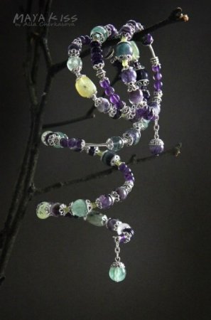 Кроме эластичного спандекса существует множество тросиков, которые не обладают свойствами растягивающейся нити, но активно применяются в создании авторской бижутерии как начинающими рукодельницами, так и опытными мастерицами. На тросик нанизываются бусины, украшенные ронделями или ажурными шапочками. Самый затруднительный момент в этом способе сборки – это крепление замочка, для чего понадобятся кримпы (зажимные бусины), калотты (детали, позволяющие скрыть узелки нити), колечки и непосредственно сам замочек.