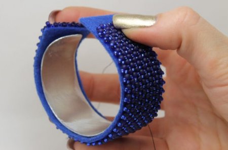Можно задействовать простые браслеты из металла как основы для приклеивания композиций из бисера. Эта направленность в handmade относится к обособленному разделу настоящего мастерства, требующего огромного терпения и старательности. На кусочек фетровой ткани клеятся кабошоны и обшиваются бисером, согласно задуманному мастером эскизу. Затем этот ансамбль приклеивается к кусочку кожи, прикрепляемому к металлической основе.