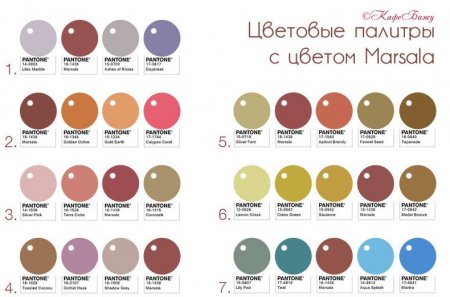 Marsala символизирует естественность, обволакивающую теплоту и изысканность. Этот насыщенный цвет будет хорошо смотреться как самостоятельно, так и в палитрах. Без сомнения, он с легкостью займет достойное место в одежде, аксессуарах, макияже, дизайне и интерьерах. Рекомендации Color Institute Pantone по сочетанию цвета Marsala: