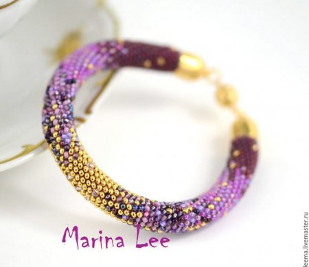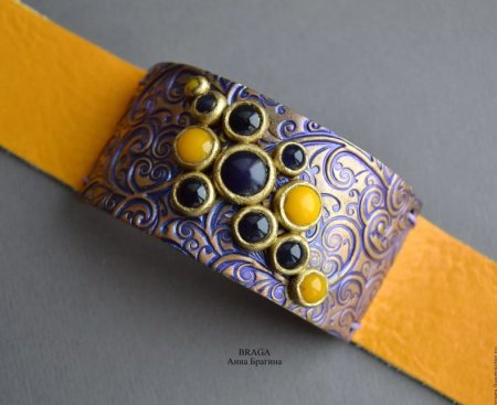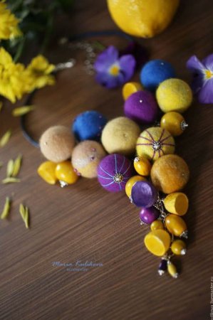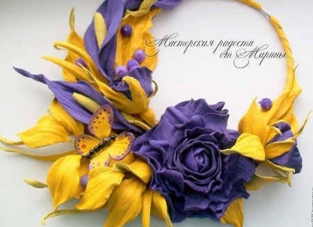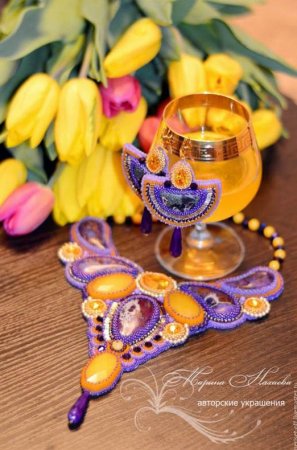 Возьмем за основу золотисто-желтый оттенок и к нему легко впишутся детали разных оттенков фиолетового цвета – от светло-сиреневого до черничного. Такое украшение будет выглядеть ярко, нарядно и солнечно.