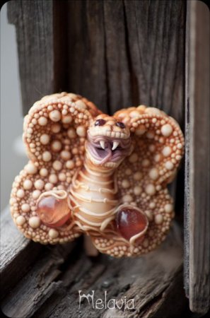 Есть. В частности извечная проблема прозрачностей и желтизны. Было потрачено немало сил на поиск альтернативы эпоксидной смоле, которая желтеет со временем, чтобы делать имитации плоти и росы на работах. Также имеет вес прозрачность самой полимерной глины – из-за недавней неспокойной экономической обстановки в стране поисчезала прозрачная пластика марки premo, без которой мне было сложно добиться эффектов прозрачностей и глубины. А появившись, она стала стоить в два раза дороже, что вызвало бы подорожание моих работ. Я нашла альтернативы этой марке и теперь делаю смеси на ее основе.