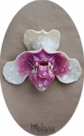 Альтернативная флористика – это создание таких растений, конструкция которых дополняется атрибутами, не относящимися к фауне – зубами, глазами и иными элементами. Для дополнения образа хищного растения я использую не типичные цвета, элементы филиграни и традиционные для полимерной глины кейны и филигрань.