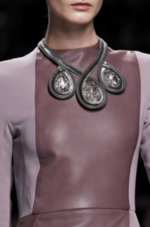 Агрессивная стилистика. Тон когда-то задали Philipp Plein со своими симпатичными черепами, любители рока и байкеры с цепями и пряжками, но всё-таки это были украшения «на любителя». Сейчас даже романтичные барышни могут украсить себя такими подвесками, например, с оскаленной пастью льва, с ключами, замками. Такие украшения только подчеркнут, на удивление, их женственность.- Блеск метала. Конструкции из широких полос метала, опоясывающие горло, т. н ожерелья-чокеры или напоминающие скифские пекторали колье, сложно назвать украшениями, но они очень актуальны. Ценность их в завораживающей блестящей поверхности и в строгой геометрии форм.